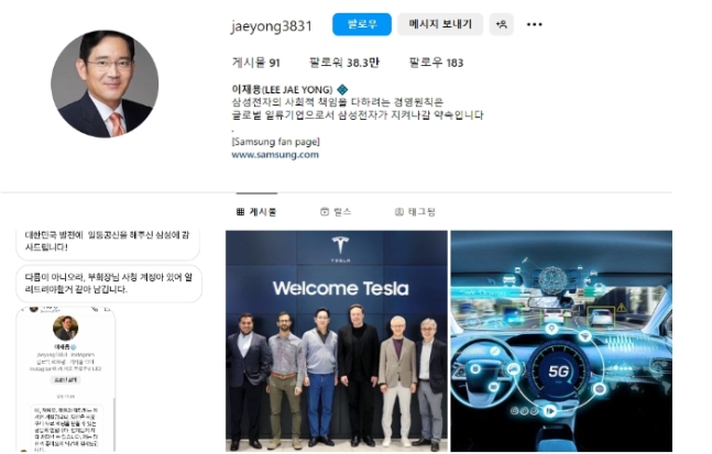 팔로워 38만 명을 보유한 이재용 삼성전자 회장의 사칭 계정 [사진 = 인스타그램]