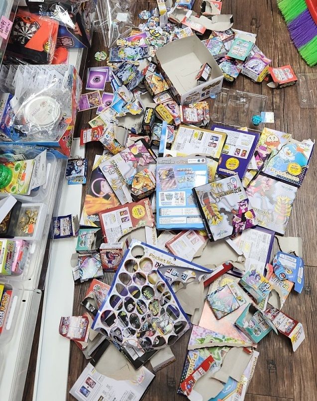 A씨는 곧장 집을 나서서 문구점으로 향했는데, 매장에 들어간 순간 말문이 막혔다고 전했다. 카드와 딱지가 포장이 뜯긴 채 바닥에 수북이 쌓여 있었던 것이다.