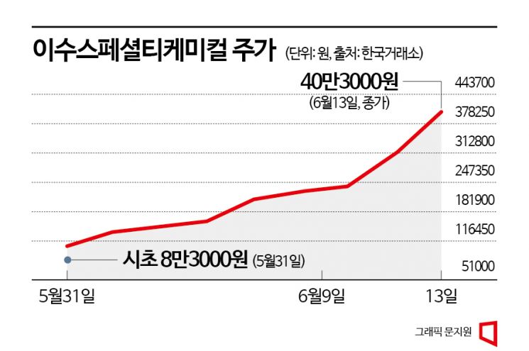 한국거래소에 따르면 이수스페셜티케미컬은 재상장한 5월31일부터 6월13일까지 9거래일 연속 상승했다. 13일 이수스페셜티케미컬은 가격제한폭(30.00%)까지 오른 40만3000원에 장을 마쳤다. 이는 5월31일 시초가인 8만3000원 대비 약 5배가량으로, 평가가격(4만1500원)과 비교해서는 약 10배 이상으로 오른 셈이다. 이수스페셜티케미컬은 재상장 첫날인 5월31일에도 가격제한폭까지 올라 10만7900원에 거래를 마쳤다. 이수스페셜티케미컬은 이수그룹 계열사인 이수화학에서 인적분할된 정밀 화학 및 전고체 전지 소재 전문 기업이다. 인적분할 이후 지난달 31일 거래가 재개된 이수화학(기존 이수화학의 석유화학 부문)의 주가도 2거래일 연속 상승세를 이어가는 등 시장에서는 인적분할을 호재로 받아들이는 분위기다.