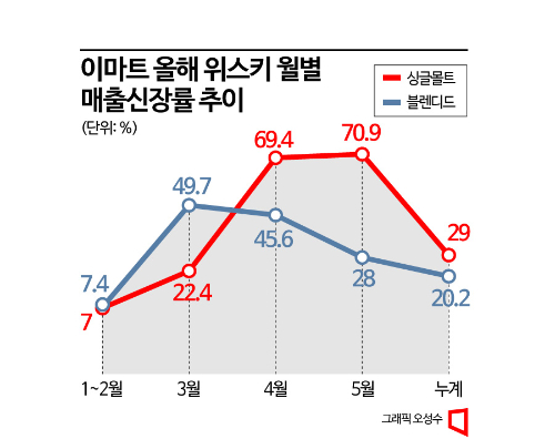 늘어난 수입량만큼 판매도 빠르게 증가하고 있다. 올해 이마트의 싱글몰트·블렌디드 위스키 매출액은 5월 말 기준 지난해 같은 기간보다 각각 29.0%, 20.2% 증가했다. 특히 싱글몰트 위스키는 1~2월 7.0%, 3월 22.4%, 4월 69.4%, 5월 70.9%로 매달 매출신장률을 끌어올리고 있다. 이마트 관계자는 “최근에는 전통적으로 인기가 있었던 블렌디드 위스키보다 증류소의 개성이 담긴 싱글몰트에 대한 수요가 지속적으로 이어지고 있다”며 “발베니, 맥캘란, 글렌피딕, 글렌파클라스 등 싱글몰트 위스키가 전체 매출 신장을 주도하고 있다”고 설명했다.