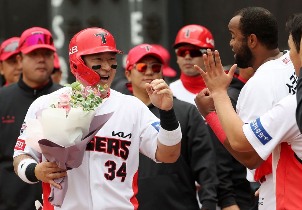 23일 광주기아챔피언스필드에서 열린 프로야구 삼성 라이온즈와 KIA 타이거즈의 경기에서 1회에 2루타를 때리며 KBO 통산 최다 2루타 신기록을 달성한 KIA 최형우가 김종국 감독으로부터 꽃다발을 받은 뒤 선수들과 하이파이브 하고 있다. [이미지출처=연합뉴스]