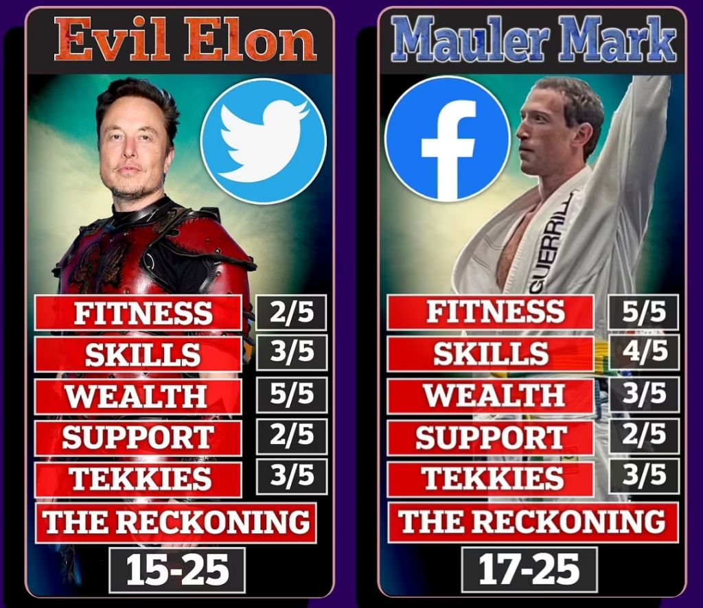 반면 머스크가 저커버그와 비교해 우위를 보이는 부분은 체급이다. 머스크는 키 190cm에 몸무게도 대략 80kg 가까이 나간다. 반면 저커버그는 키 170cm 초반에 몸무게 또한 70kg가량이다.