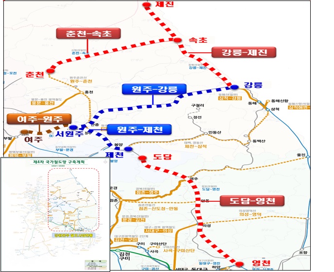 세부사업으로는 동해북부선 강릉∼제진 단선전철 2828억원, 춘천∼속초 동서고속화 단선전철 2275억원, 경강선 여주∼원주 복선전철 795억원, 중앙선 도담∼영천 복선전철 2572억원, 원주∼제천 복선전철 38억원 등을 사업을 위해 올해 사업비 8508억 원을 투입한다.