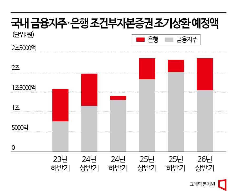 금융지주사와 은행권의 조건부자본증권(코코본드) 발행이 줄을 잇고 있다. 5년 전 발행한 코코본드의 조기 상환일이 다가오는 데다, 경기 악화에 대비해 선제적으로 자본 완충력을 확보하려는 움직임으로 풀이된다. 올해 6월 이후 하반기 금융회사의 코코본드 발행액이 2조원을 훌쩍 넘어설 전망이다.