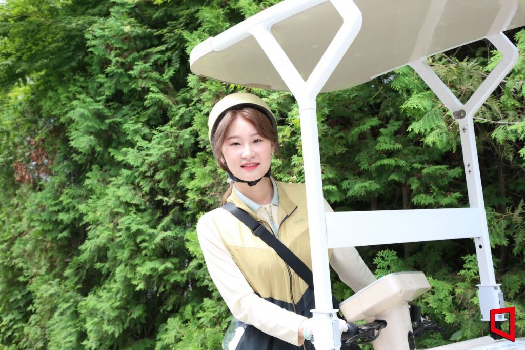 서담비 hy 공덕점 프레시매니저가 헬멧과 유니폼 등 업무 복장을 착용한 뒤 전동차 '코코'를 타고 배송지로 향하고 있다.[사진제공=hy]