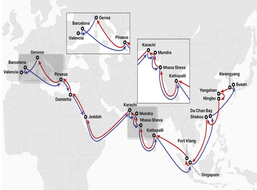 이번 노선은 극동아시아와 인도, 지중해를 연결하는 서비스로 HMM이 단독으로 운영한다. 8월 6일 부산에서 첫 출항이며, 왕복 총 84일이 소요된다. HMM은 1만1000TEU급 컨테이너선 등을 투입할 계획이다.