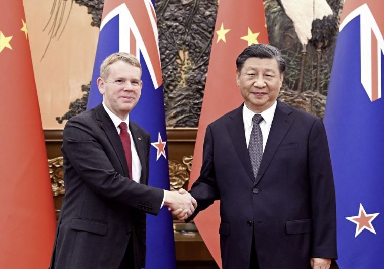 시진핑 중국 국가주석(오른쪽)과 크리스 힙킨스 뉴질랜드 총리가 지난 27일 중국 베이징 인민대회당에서 만나 악수하고 있다.[이미지출처=연합뉴스]