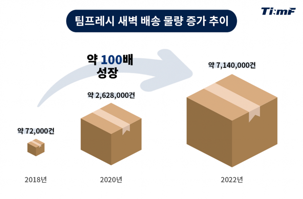 팀프레시는 2018년에 설립되어 만 4년 만인 2022년 연 매출 2,300억을 달성, 새벽 배송 제3자 물류 시장에서 80% 이상의 점유를 확보해 낸 예비 유니콘 기업이다. 팀프레시의 새벽 배송 거래 물량은 2018년 약 72,000건으로 시작하여 2022년 약 7,140,000건으로 약 100배의 폭발적인 상승세를 보였다.