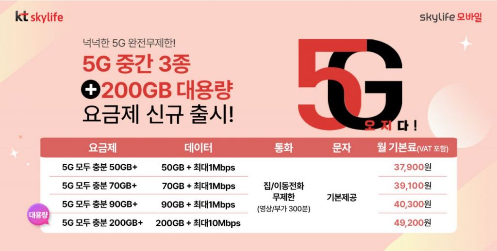 KT스카이라이프가 모바일 5G 중간요금제를 30일 출시했다.