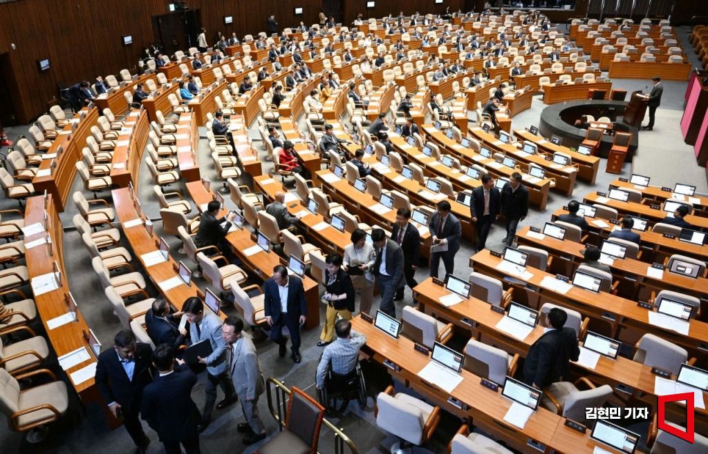 30일 국회 본회의에서 국민의힘 의원들이 '노란봉투법'(노동조합 및 노동관계조정법 개정안) 부의 여부 토론 중 퇴장하고 있다. 사진=김현민 기자 kimhyun81@