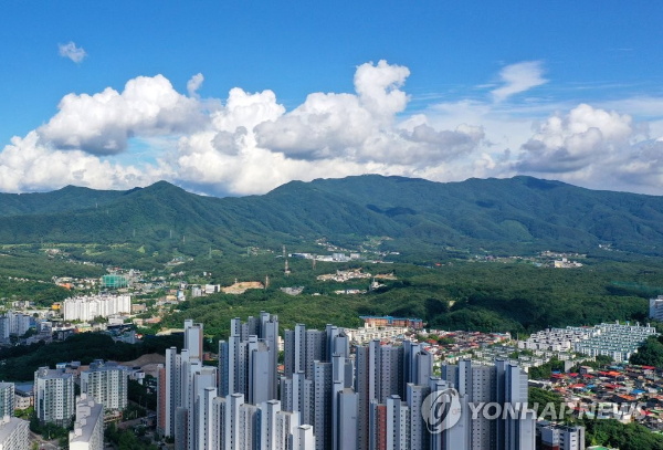 전국 곳곳에 장맛비가 잠시 소강상태를 보인 30일 오후 강원 춘천 도심 위로 비구름과 뭉게구름, 파란 하늘이 어우러져 있다. [사진제공=연합뉴스]