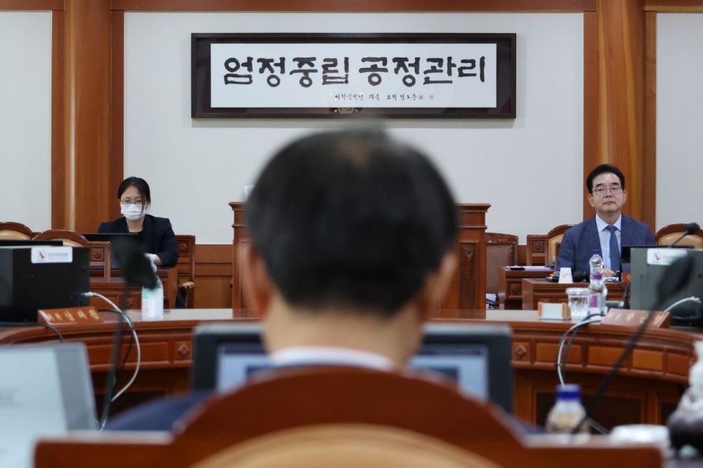노태악 중앙선거관리위원장이 지난달 31일 오후 과천 중앙선거관리위원회에서 고위직 간부들의 자녀 특혜 채용 관련 대책을 마련하기 위해 열린 긴급 위원회의를 주재하고 있다. [이미지출처=연합뉴스]