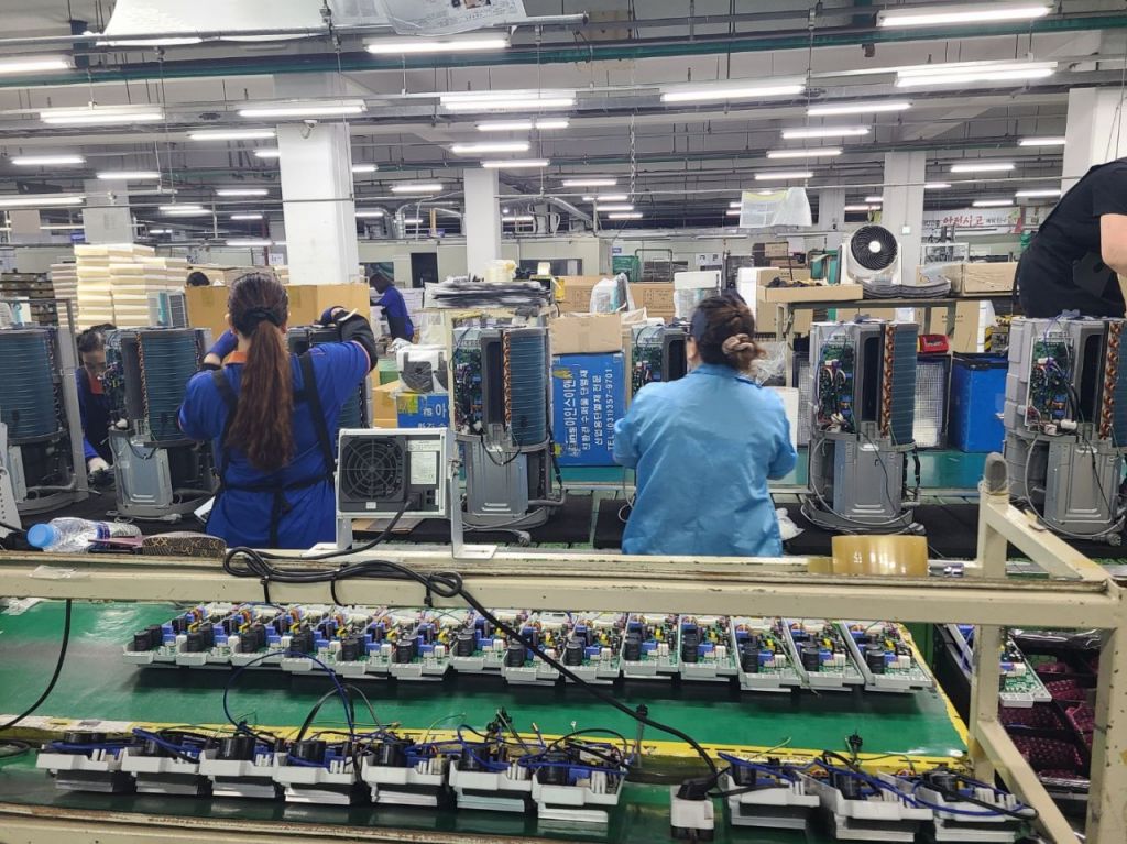파세코 직원들이 창문형 에어컨 제조공장에서 작업하고 있다.