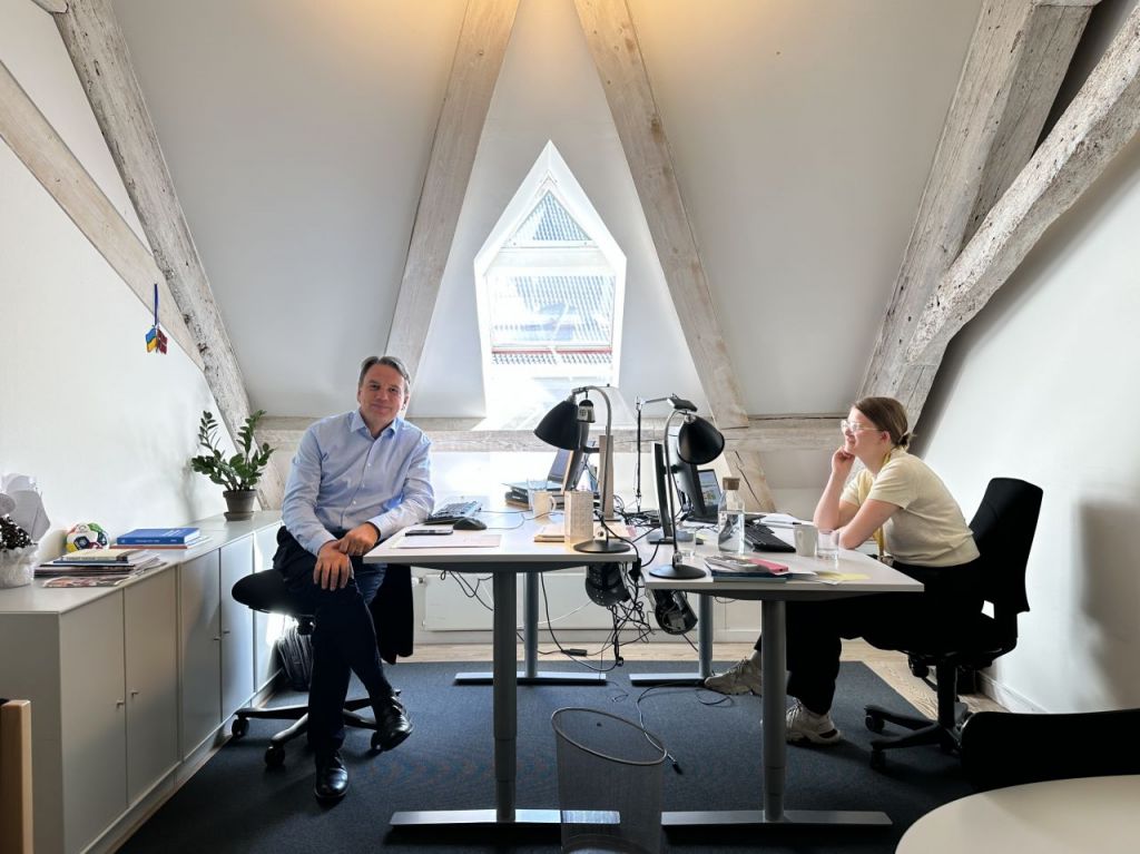 크리스티안 프리스 바흐(Christian Friis Bach·57) 급진자유당 의원이 자신의 의원실에서 인턴 비서관과 함께 일을 하고 있다.