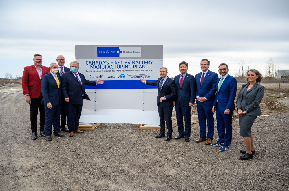 왼쪽부터 마크 스튜어트 스텔란티스 COO(최고운영책임자), 더그 포드 캐나다 온타리오주 주지사(왼쪽에서 네번째), 프랑수아 필립 샴페인 캐나다 산업부 장관(왼쪽에서 다섯번째), 김동명 LG에너지솔루션 자동차전지사업부장 부사장(왼쪽에서 여섯번째)이 온타리오주 윈저(Windsor)시에서 ‘LG에너지솔루션-스텔란티스 합작공장’ 기념사진을 촬영하고 있다. 사진제공=LG에너지솔루션