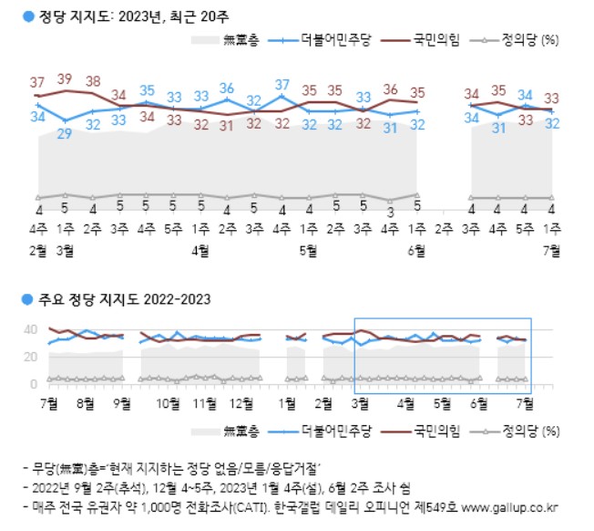 7일 여론조사기관 갤럽의 자체 정례 여론조사(4~6일 전국 만 18세 이상 성인남녀 1000명을 대상으로 전화조사원 인터뷰 방식으로 진행)에 따르면 국민의힘 지지율은 33%, 민주당은 32%, 정의당 4%, 지지하는 정당 없음은 30%로 조사됐다. 국민의힘 지지율이 지난주와 같은 가운데 민주당 지지율이 2%포인트 하락한 점이 눈길을 끈다.