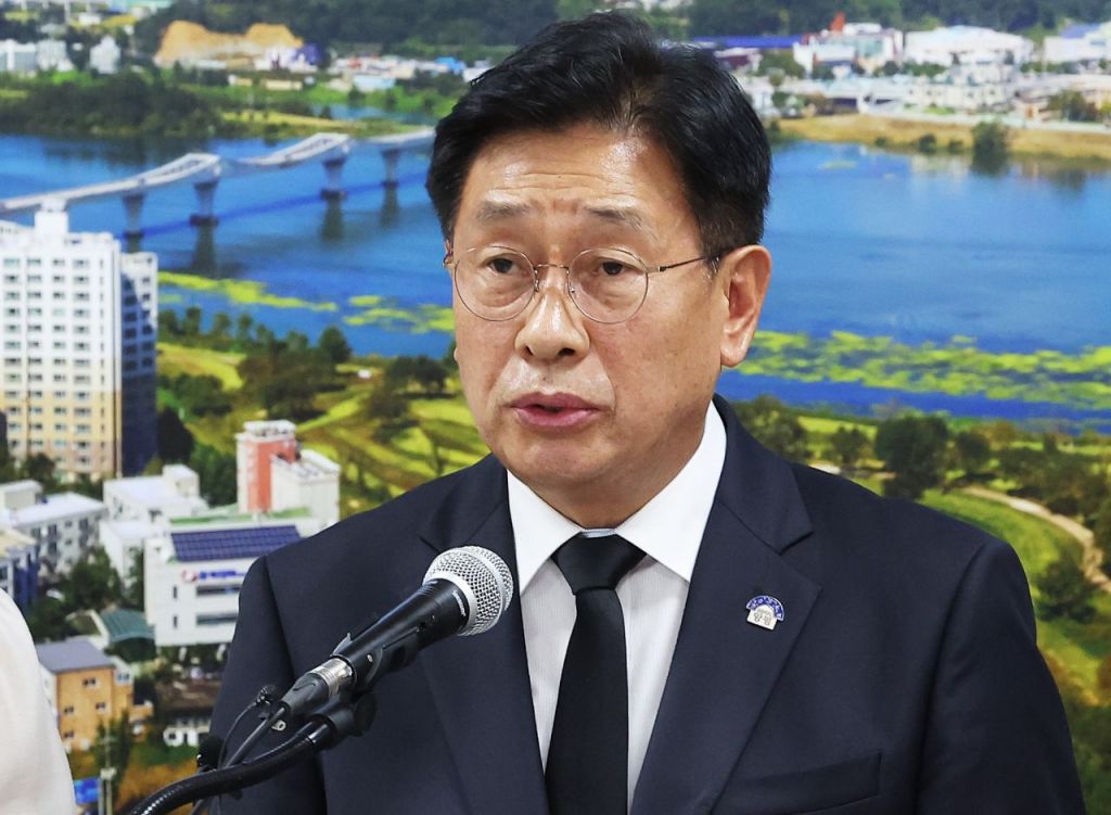 6일 오후 경기도 양평군청에서 전진선 양평군수가 서울-양평 고속도로 사업 백지화 관련 성명서를 발표하고 있다. 2023.7.6 [이미지출처=연합뉴스]