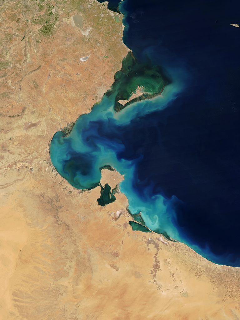 2017년 3월18일 NASA의 아쿠아 위성이 촬영한 아프리카 튀니지 일대 해수면에 녹조류가 번성해 바다의 색깔이 녹색으로 변했다. 사진출처=NASA 홈페이지