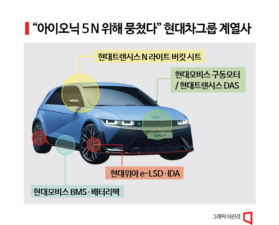 이같은 기술을 탑재하기 위해 현대차그룹 계열사가 머리를 맞댔다. 본지 취재를 종합하면 현대모비스는 아이오닉5N에 구동모터, 배터리 관리 시스템(BMS), 배터리팩 등을 공급했다. 현대위아는 e-LSD, IDA를 공급해 이 차량의 핸들링·코너링 성능 향상에 기여했다. 현대트랜시스는 N 라이트 버킷 시트와 DAS(주행 상황에 따라 모터와 구동축을 분리하거나 연결해 이륜·사륜 구동으로 전환해주는 장치)를 제공했다. 이 시트는 측면 볼스터 부분을 강화해 급격한 코너링 중에도 운전자를 지지해준다. DAS는 불필요한 동력 손실을 줄여 전기차 주행거리를 늘린다.