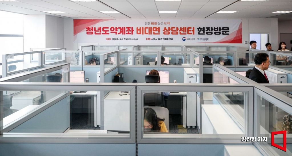 매월 70만원씩 5년간 적금하면 최대 5천만원의 목돈을 마련할 수 있는 '청년도약계좌'가 출시된 15일 서울 중구 청년도약계좌 비대면 상담센터 상담원들이 상담을 하고 있다. 사진=강진형 기자aymsdream@