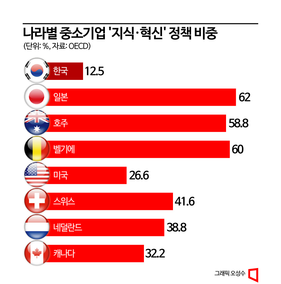 반면 주요국들은 혁신 네트워크 지원에 총력을 기울이고 있다. 노벨상 수상자까지 배출하는 등 중소기업이 탄탄하다고 평가받는 일본의 경우 지식·혁신 정책에만 국가역량의 62%를 쏟고 있다. 클러스터(3.4%)와 전략적 파트너십(10.3%)에도 일정 부분 비중을 두고 있다. 반면 생산·공급 지원정책은 24.1%로 한국보다 작다. 벨기에(60%)나 호주(58.8%), 독일(33.3%), 캐나다(32.2%)와 같은 선진국들도 지식·혁신 정책에 무게를 두고 있다.