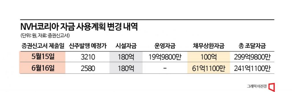 엔브이에이치코리아 신주 발행가격이 예상보다 낮아지면서 채무 상환 계획에 차질이 발생했다. 엔브이에이치코리아는 유상증자를 통해 조달한 자금으로 미국 현지 생산을 위한 부지 매입과 채무 상환 등에 사용하려 했다. 조달 규모가 줄어들면서 시설자금 계획은 유지하고 상환 규모를 줄이기로 했다.
