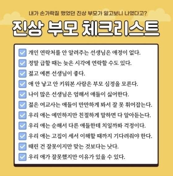 최근 서울 서이초등학교에서 발생한 신규 교사 사망사건을 비롯해 초등학생이 교사를 폭행하는 사건 등 교권 침해 사례가 잇따라 발생하는 가운데, '진상 부모 체크리스트'가 주목받고 있다.[사진출처=온라인 커뮤니티]