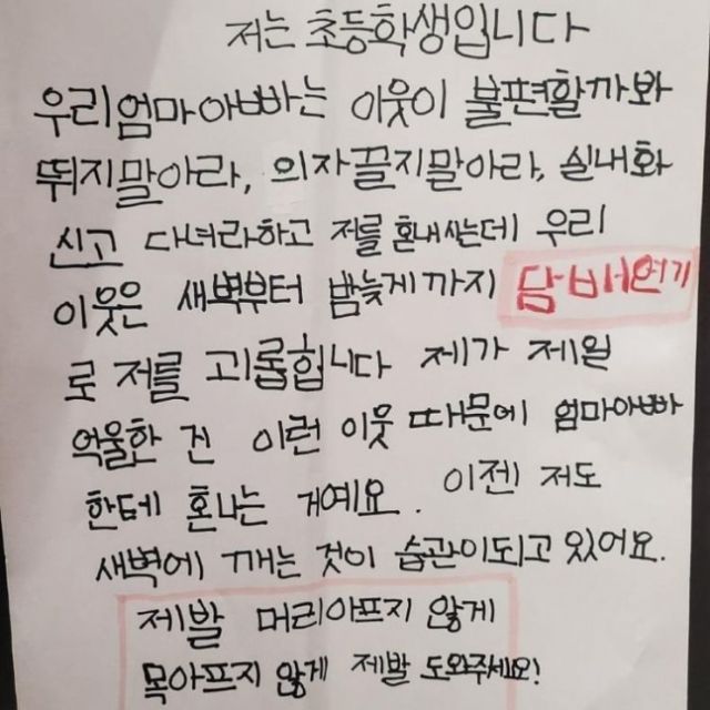 학생은 “우리 엄마 아빠는 이웃이 불편할까 봐 ‘뛰지 말아라, 의자 끌지 말아라, 실내화 신고 다녀라’ 하고 저를 혼내시는데 우리 이웃은 새벽부터 밤늦게까지 담배 연기로 저를 괴롭힙니다”며 “억울한 건 이런 이웃 때문에 엄마 아빠한테 혼나는 것”이라고 썼다. 담배 연기라는 단어는 빨간색으로 쓴 후 형광펜으로 강조하기까지 했다.