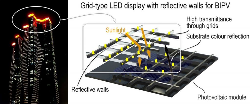 격자형 LED 디스플레이 모듈을 이용해 광고와 영상 재생이 가능한 건물 일체형 태양광 모듈 이미지.