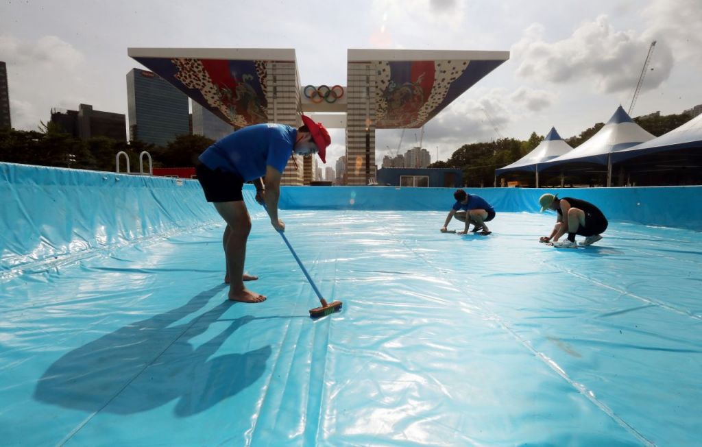 송파구 올림픽공원 평화의광장에 마련되는 '하하호호 올림픽 물놀이장' 개장 준비가 한창이다.
