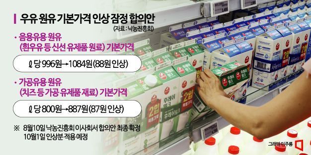 28일 관련 업계에 따르면 낙농가와 유업계 관계자로 구성된 낙농진흥회는 전날 오후 늦게까지 열린 원유 기본가격 조정 협상 소위원회 11차 회의를 통해 오는 10월부터 흰우유와 발효유 등 신선 유제품에 사용하는 음용유용 원유 기본가격을 ℓ당 88원 인상하기로 합의했다. 치즈와 연유, 분유 등 가공 유제품에 사용되는 원유 기본가격은 87원 오른다. 이번 인상폭은 2013년 원유가격연동제가 도입된 첫해 106원 이후 두 번째로 큰 규모다.