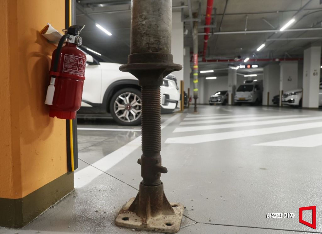 지하주차장 보강철근이 빠진 것으로 드러난 남양주 별내퍼스트포레 아파트 지하주차장에 임시 보강 구조물을 설치해 놓았다. 사진=허영한 기자 younghan@