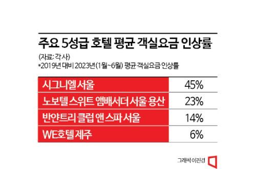 현대그룹 계열사인 반얀트리 클럽 앤 스파 서울의 올해 객실 평균 요금은 2019년 대비 14% 증가했고, 지난해 대비로는 5.5% 뛰었다. 또 노보텔 스위트 앰배서더 서울은 2019년 대비 23%, 지난해 대비 11% 인상됐다. 서울 지역 호텔과 비교해 상대적으로 인상률이 높진 않았지만, 제주 WE호텔의 경우에도 2019년 대비 6% 올랐다.