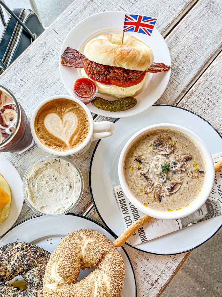 런던 베이글 뮤지엄 대표 메뉴인 '베이컨 감자 샌드위치'와 '머쉬룸 스프', '참깨 베이글'[사진제공=롯데백화점].