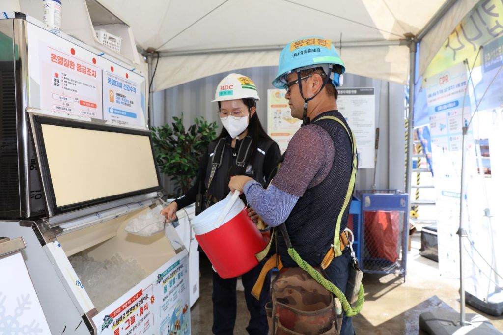 HDC현대산업개발은 전 현장에 냉방시설과 냉동고, 음료 등이 마련된 ‘개방형 고드름 쉼터’를 설치하며 현장 근로자의 온열질환 예방에 집중하고 있다.
