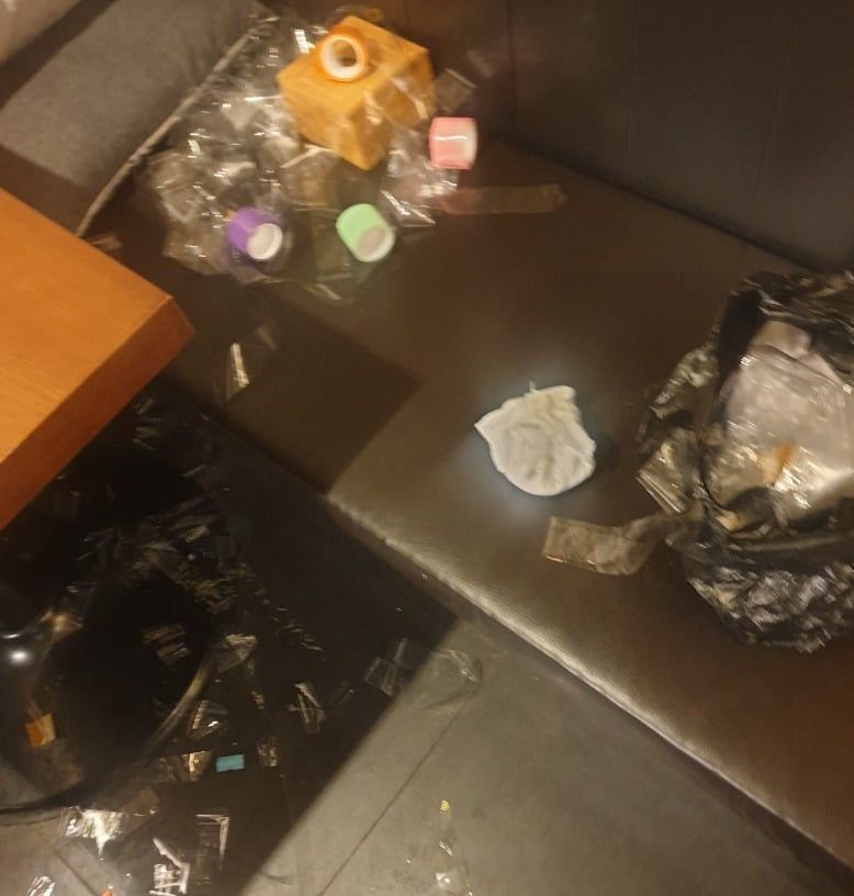 그가 공개한 사진을 보면 실제로 의자에 검은 봉지가 있고 그 안에 쓰레기로 보이는 각종 비닐이 들어 있다. 이뿐만이 아니라 바닥과 테이블, 의자 곳곳에 쓰레기가 나뒹굴고 있었다.