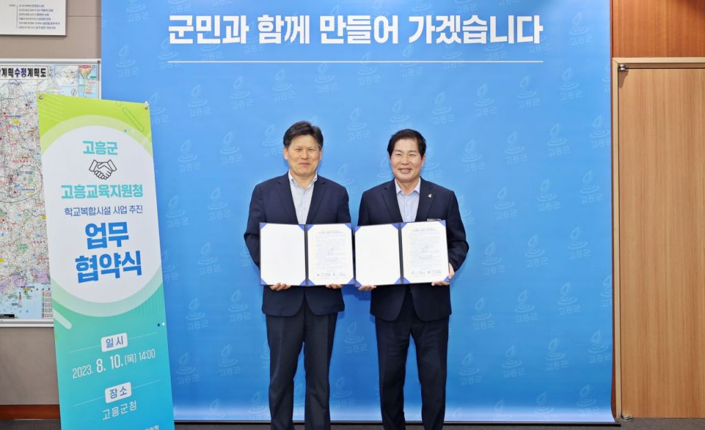 전남 고흥군(군수 공영민)은 10일, 군청 군수실에서 학교복합시설 사업의 안정적인 추진을 위해 고흥교육지원청(교육장 박경희)과 업무협약을 체결했다고 밝혔다.