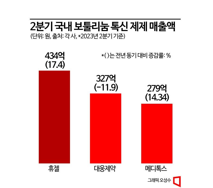 올해 2분기 톡신 제품군의 매출 변화에 대해 기업들은 각기 다른 해석을 내놨다. 휴젤 관계자는 "아시아 시장에서의 선전과 유럽 23개국 진출 완료로 성장세를 보였다"며 "국내 시장 역시 전문의약품 온라인 채널에 입점해 판매 채널을 확대하면서 매출이 늘었다"고 설명했다. 메디톡스 관계자도 "일회성 지급수수료 등의 영향이 제거되고 주력 사업 영역의 매출이 성장한 덕분"이라며 "국내 매출은 주력 품목으로 올라선 BTX 제제 코어톡스의 판매 성적이 좋았다"고 전했다.