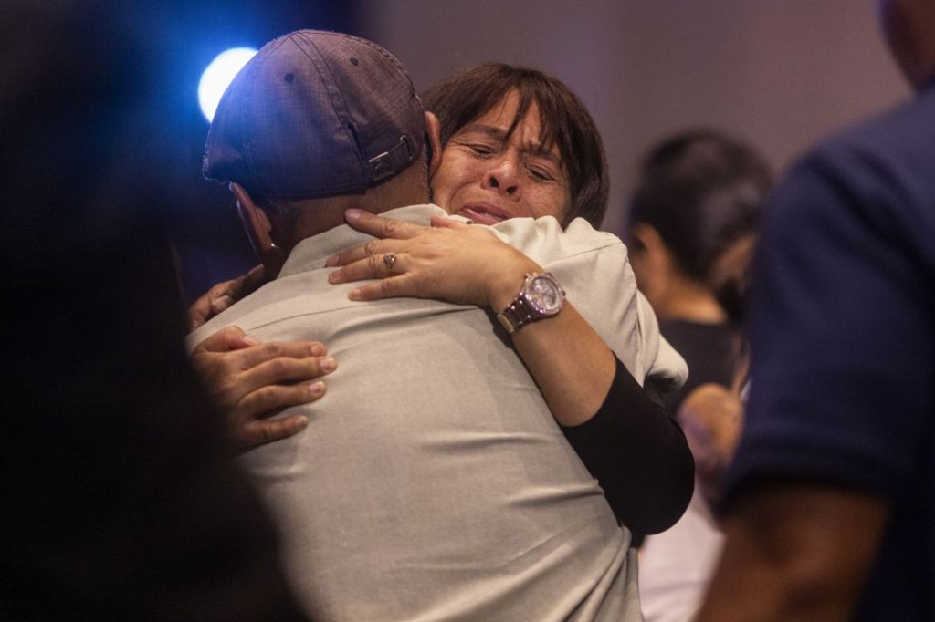 13일(현지시간) 미국 하와이 마우이섬 카훌루이의 한 교회에서 주민들이 서로를 껴안고 있다. 지난 8일 하와이에서 대형 산불이 발생해 최소 93명이 사망하고 약 60억 달러(약 7초9천900억원)의 재산 피해가 발생했다. [이미지출처=AP연합뉴스]