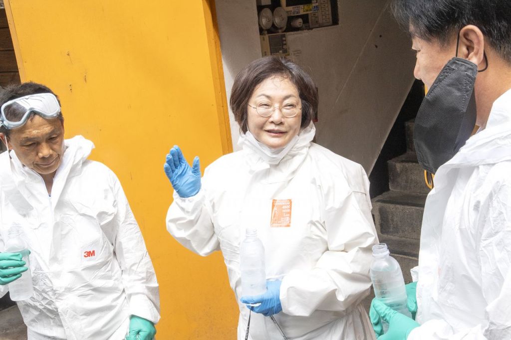 박희영 용산구청장(가운데)이 방역소독반과 쪽방 내부를 소독한 뒤 현장 근로자를 격려했다