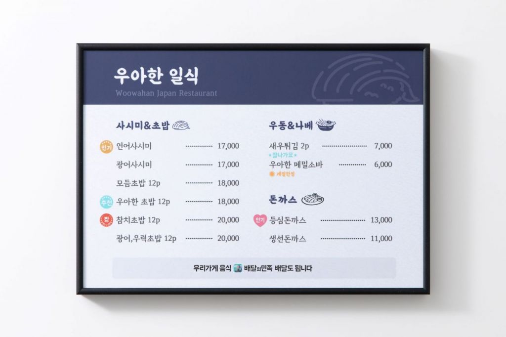 배달의민족에서 제공하는 디자인으로 제작한 메뉴판 예시