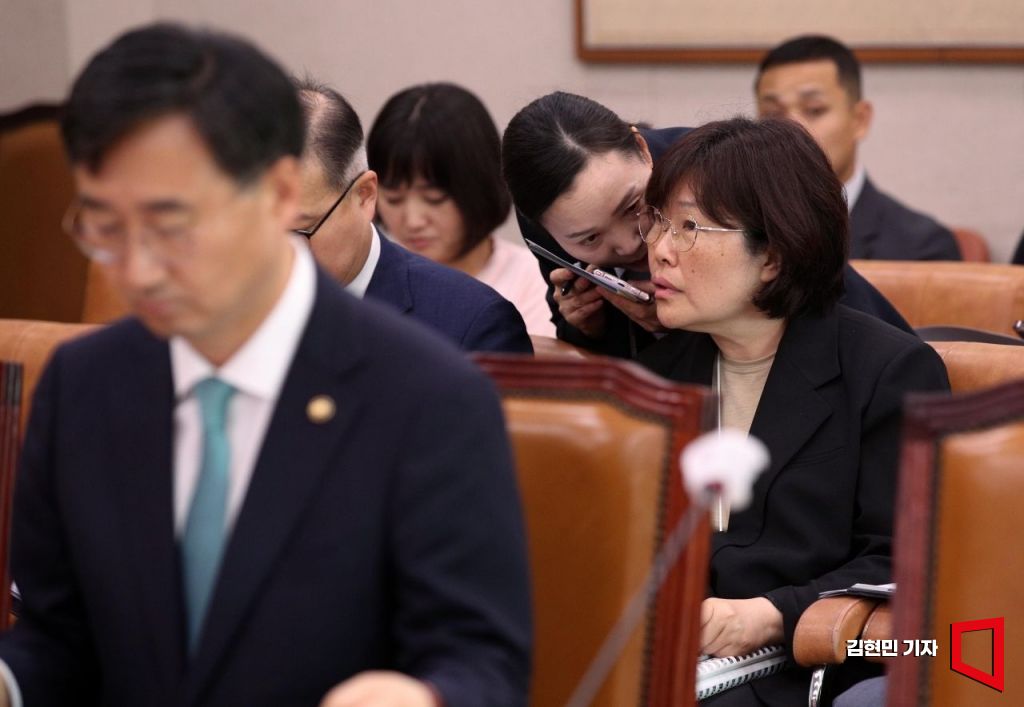 유재은 국방부 법무관리관이 21일 국회에서 열린 법제사법위원회 전체회의에서 관계자와 대화하고 있다. 사진=김현민 기자 kimhyun81@