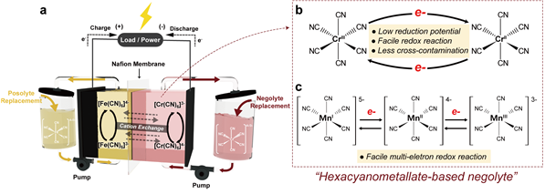 이는 탁월한 전기화학적 특성을 가지고 있어 연구팀은 세계 최초로 헥사시아노메탈레이트를 음극 전해액으로 제안해 안정성 문제를 크게 개선했다.