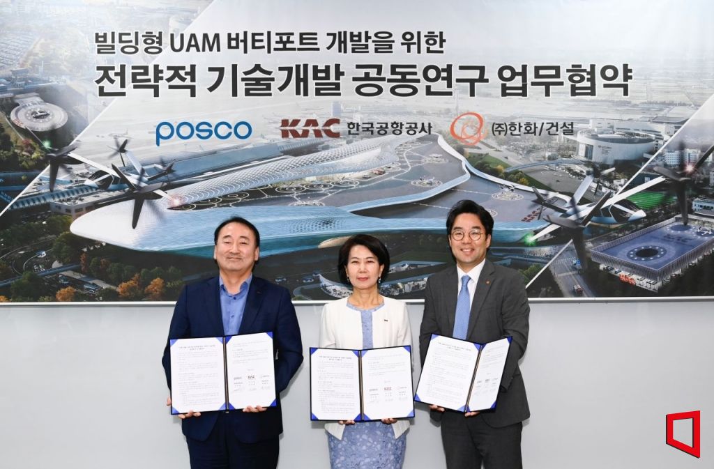 포스코는 23일 한국공항공사, ㈜한화 건설부문과 서울 강서구 한국공항공사 본사에서 '미래 UAM 건설시장 대응을 위한 전략적 기술개발' 공동연구 협약을 체결했다.