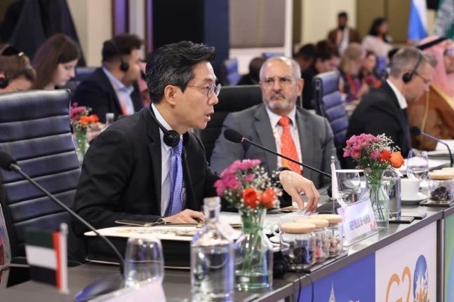 유병채 문화체육관광부 문화예술정책실장이 26일 인도에서 열린 G20 문화장관회의에 참석해 한국의 문화정책 방향을 발표하고 있다. [사진제공 = 문화체육관광부]