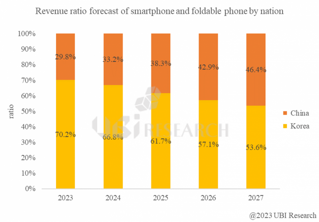 매출액 비중은 2027년까지 한국이 우위를 점할 것으로 유비리서치는 예상했다. 중국 제품이 한국 제품보다 저렴하기 때문이다.