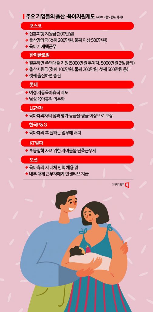 우리나라 합계출산율(가임 여성 1명이 평생 낳을 아이 수)이 0.78명이라는 것을 안 해외석학의 반응이 화제였다. 이대로면 나라가 소멸한다는 말까지 나온다. 기업 입장에선 공장을 돌릴 근로자를 찾을 수 없고 상품을 팔 소비자가 없어진다. '초저출산 1등 국가' 불명예 타이틀을 벗기 위해 기업들이 출산율과 전쟁 중이다.