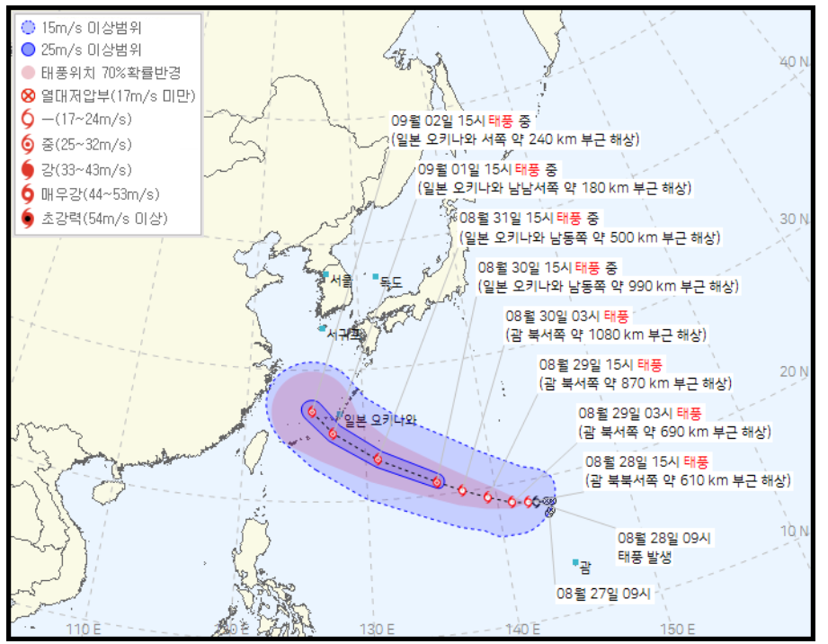 한반도에 직접적인 영향을 줄 것으로 보이는 건 태풍 하이쿠이다. 하이쿠이는 다음 달 2일에 일본 오키나와 남서쪽 약 150㎞ 해상까지 북상할 것으로 보이지만 경로를 예측하기 어렵다.