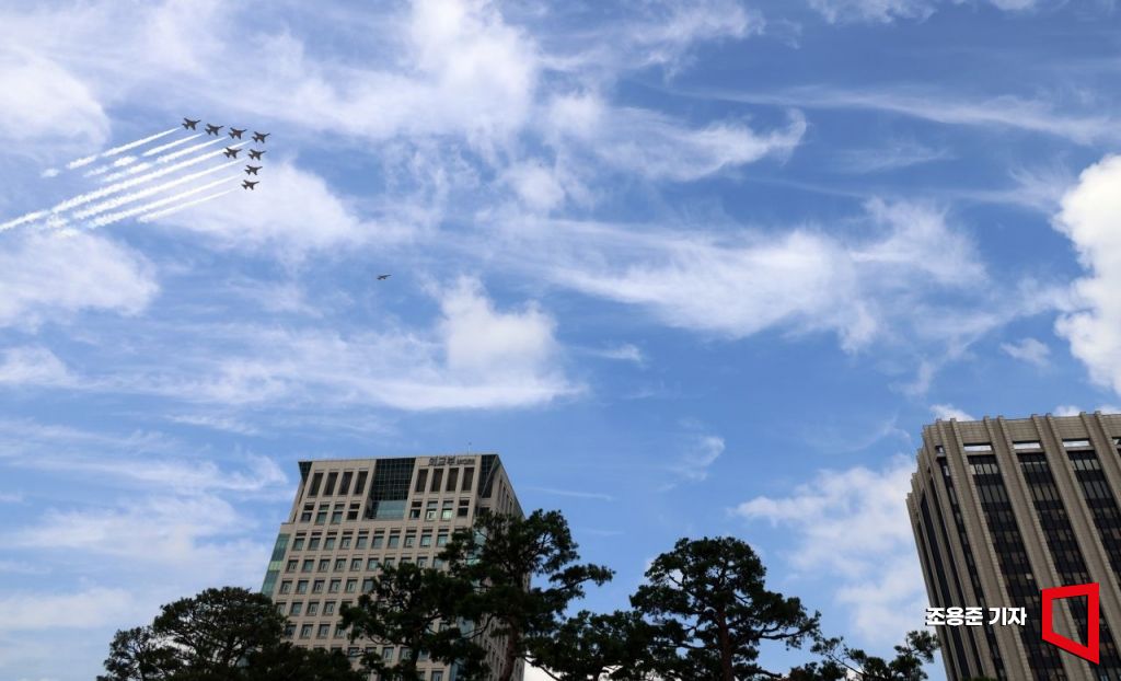공군 특수비행팀 '블랙이글스'가 31일 서울 도심 상공에서 제75주년 국군의 날 축하비행 예행연습을 하고 있다. 사진=조용준 기자 jun21@