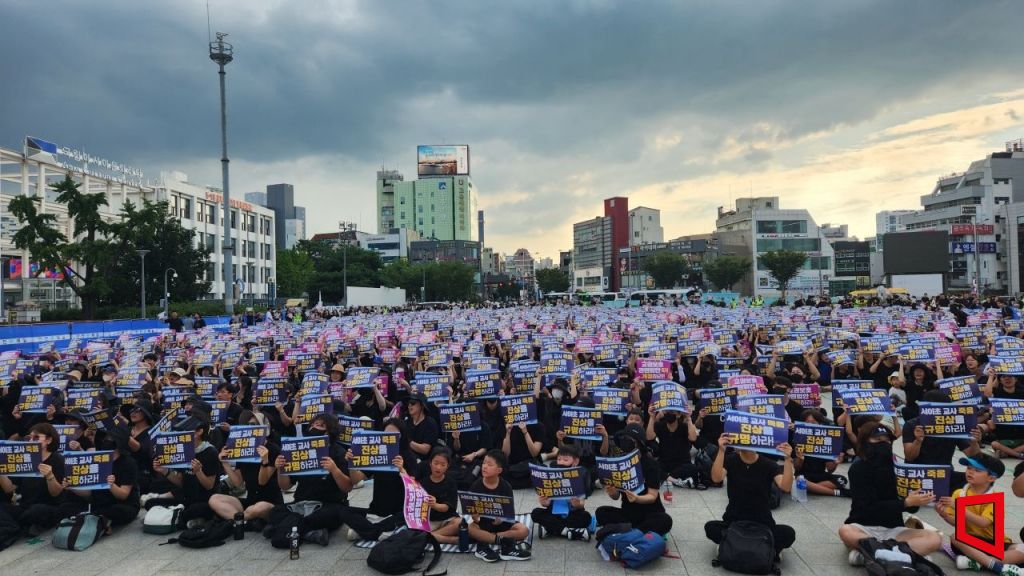 집회에 참석한 교사들과 시민들은 검정색 옷을 입고 서이초 교사의 49재를 추모했다.